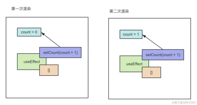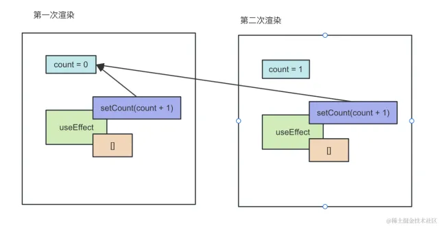 - 所以每次 setCount(count + 1) 实际上都是 setCount(0 + 1),count 只会变成 1,后面不会再变。
